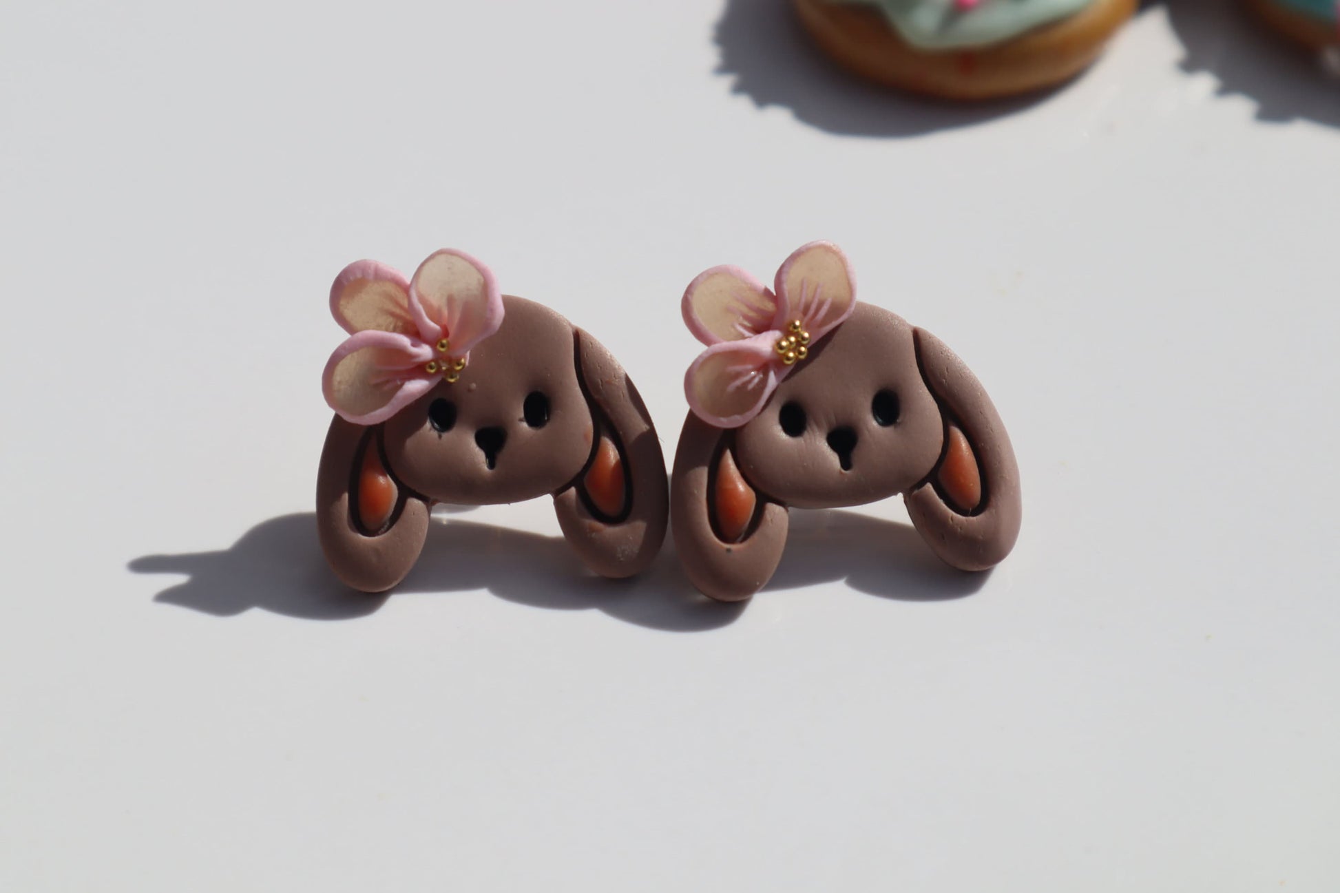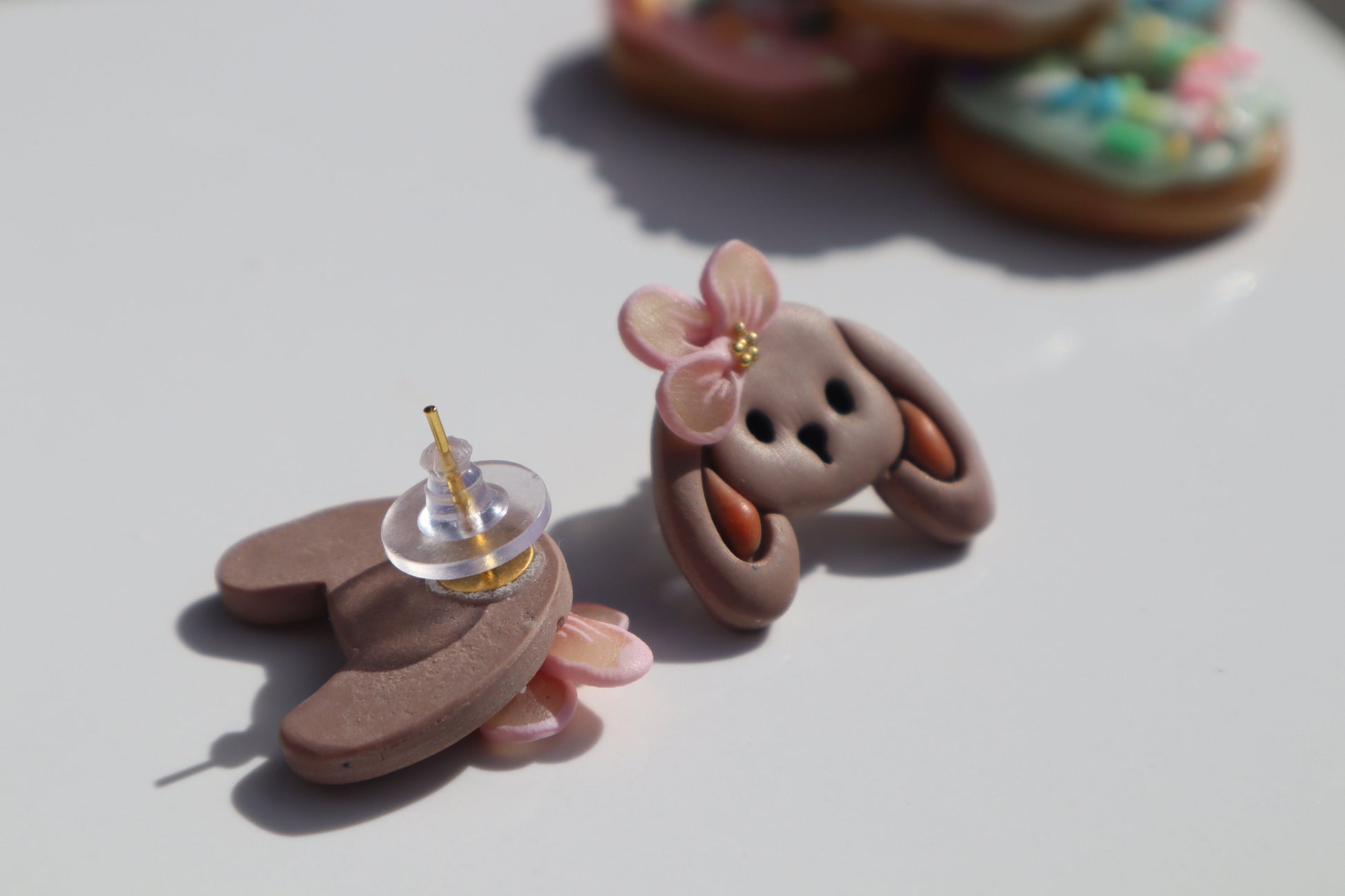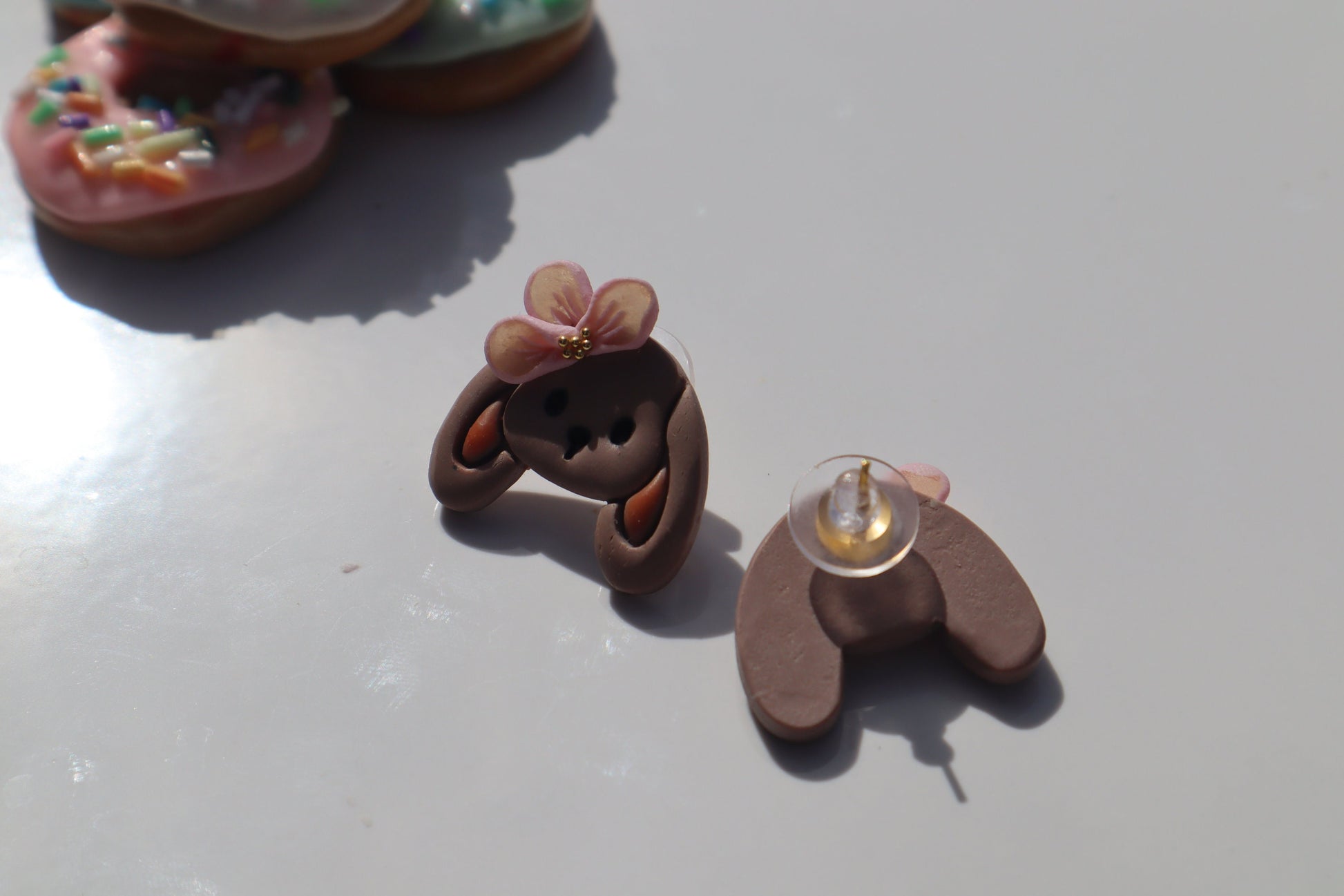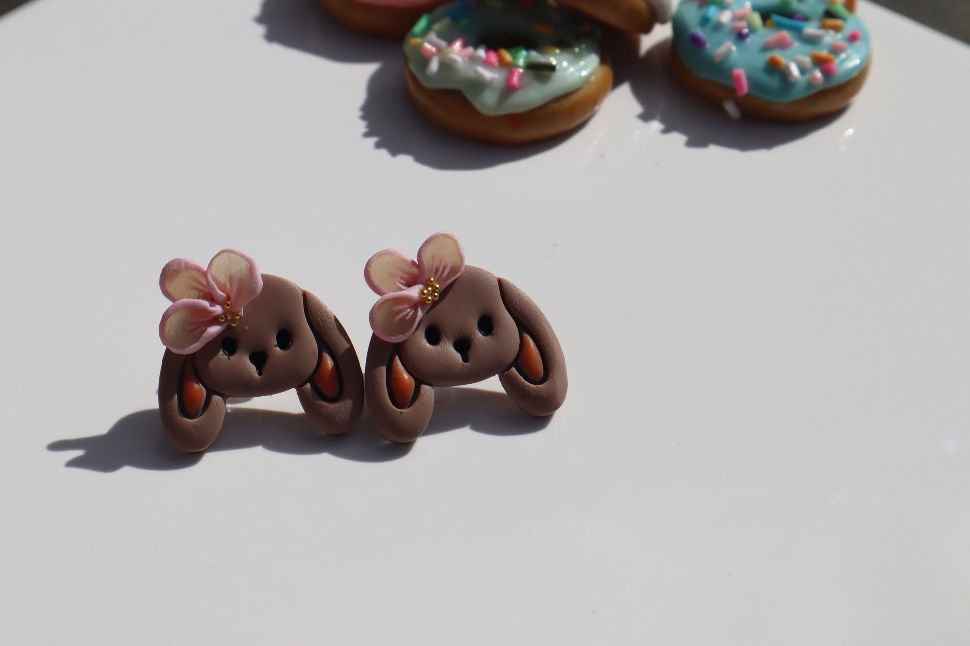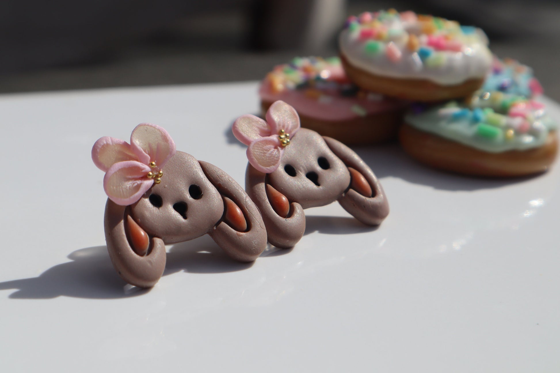 Bunny and flower studs, Resin, clay gold balls lightweight handmade beautiful stud earrings, polymer clay, Nickel free gold findings.