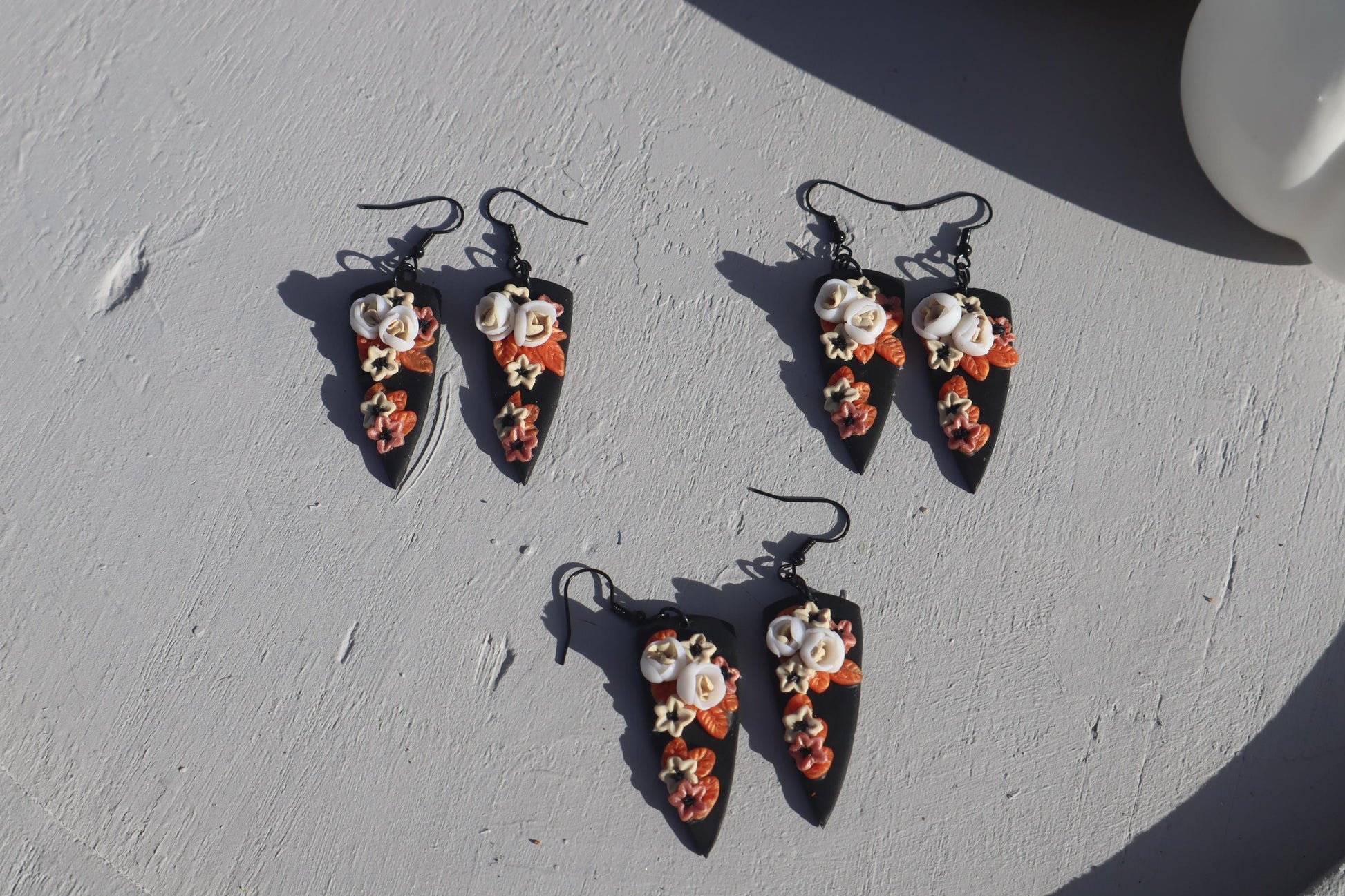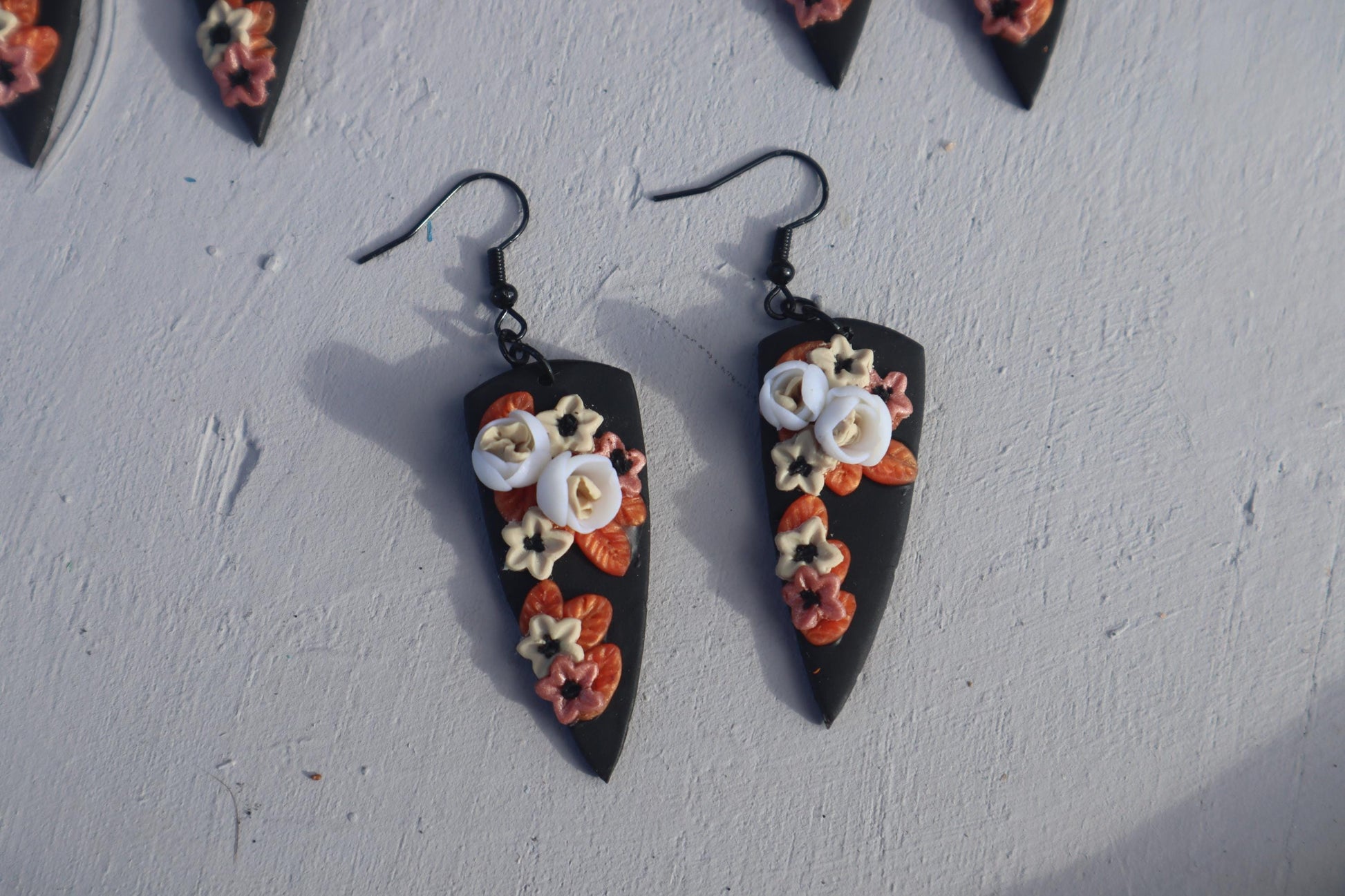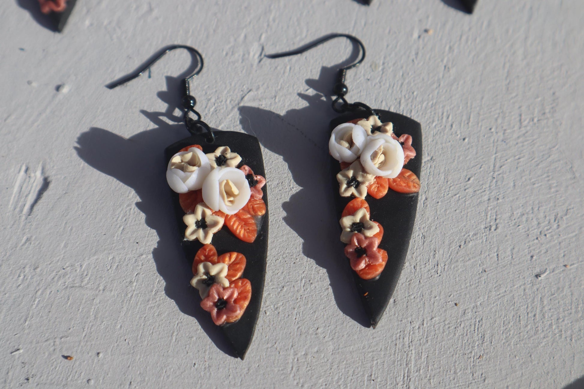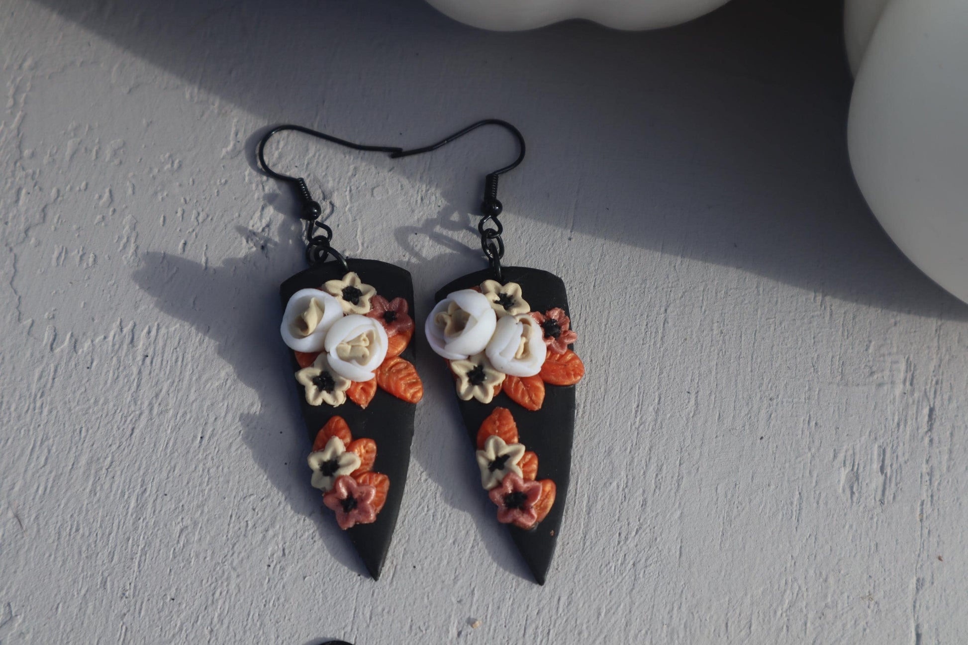 Halloween floral dagger shape dangles, clay lightweight handmade beautiful earrings, polymer clay, Nickel free findings fall autumn