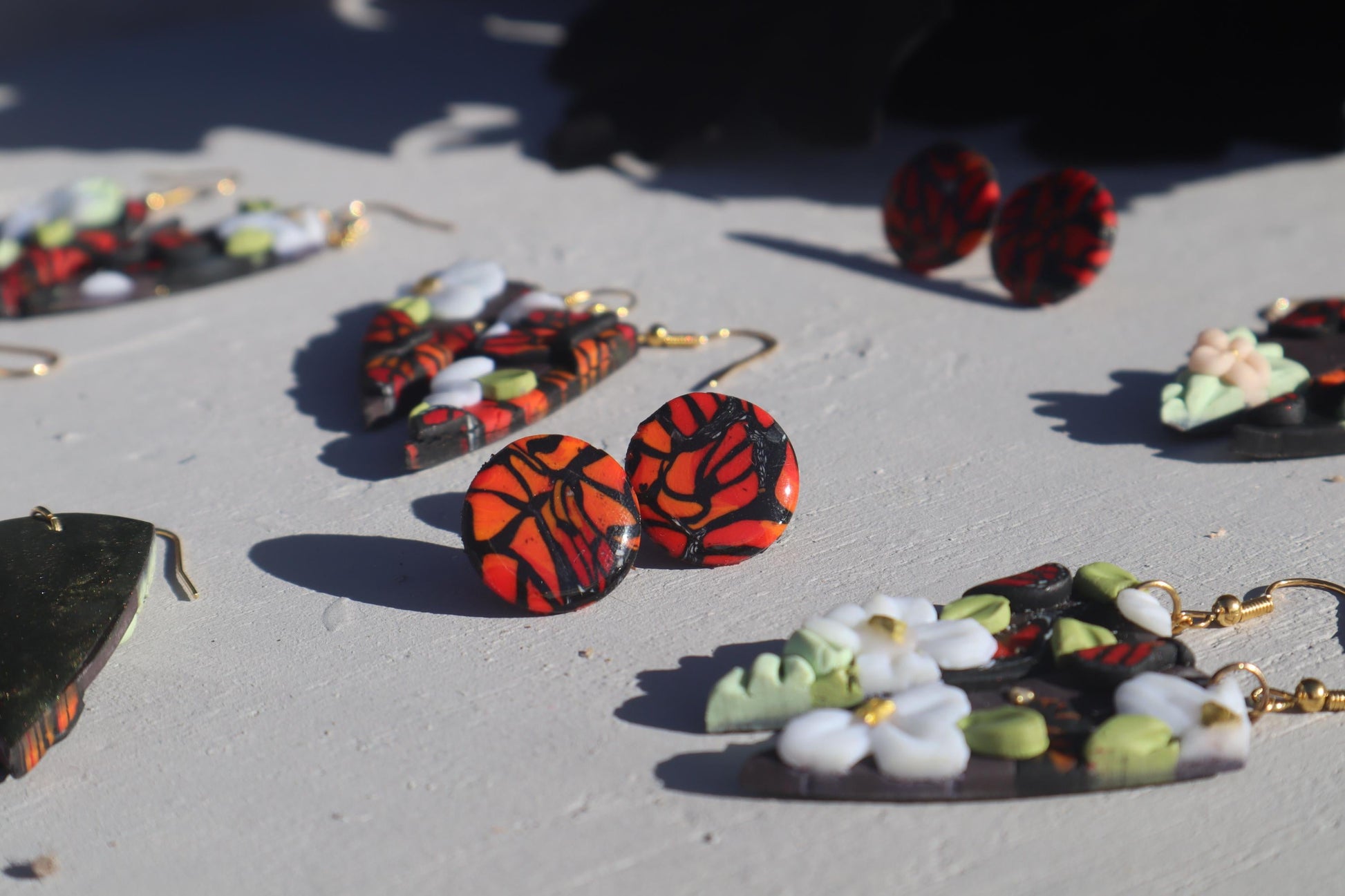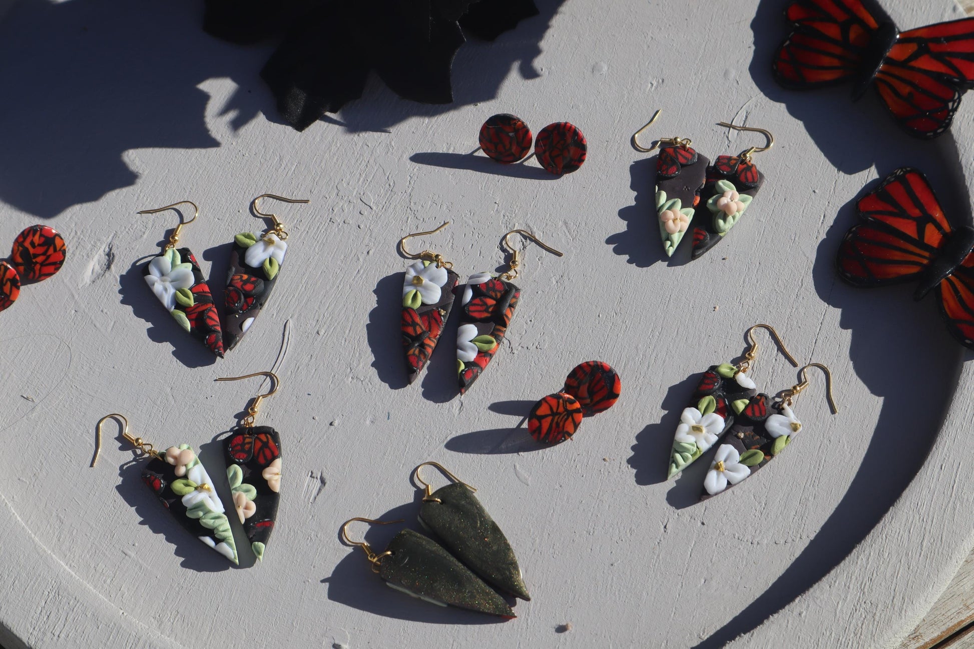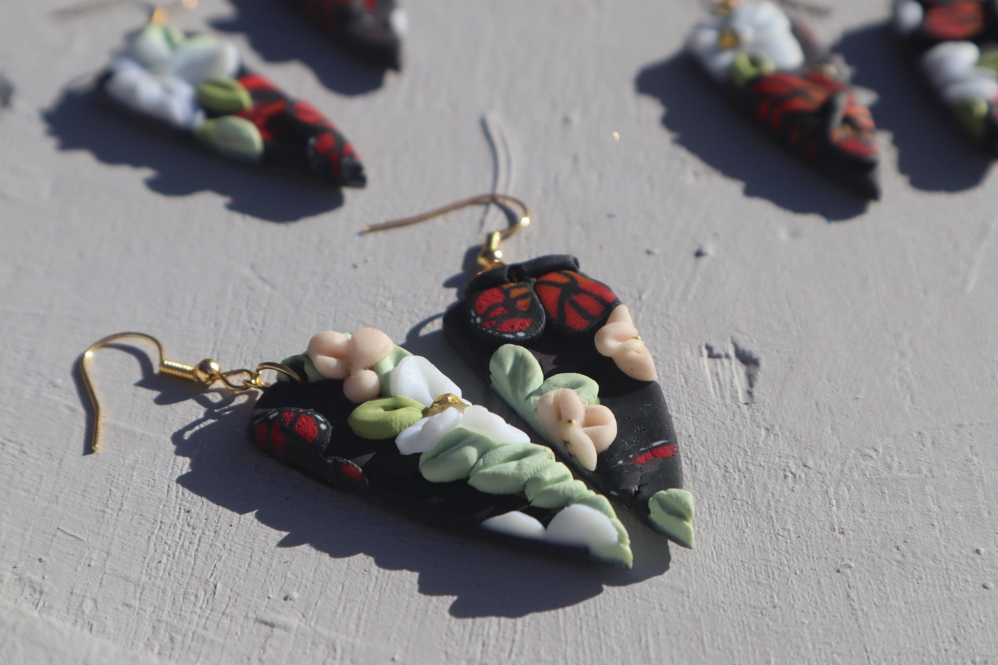 Monarch Madness dagger shape floral dangles, clay lightweight handmade beautiful earrings, polymer clay, Nickel free findings