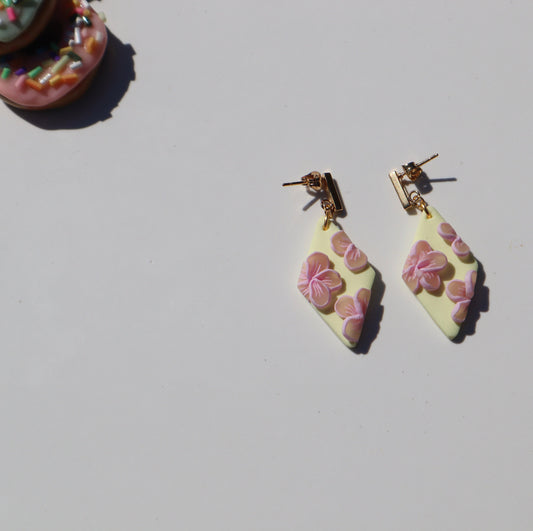 Pastel yellow flower dangle studs, clay lightweight handmade beautiful stud earrings, polymer clay, Nickel free 18k gold plated findings.